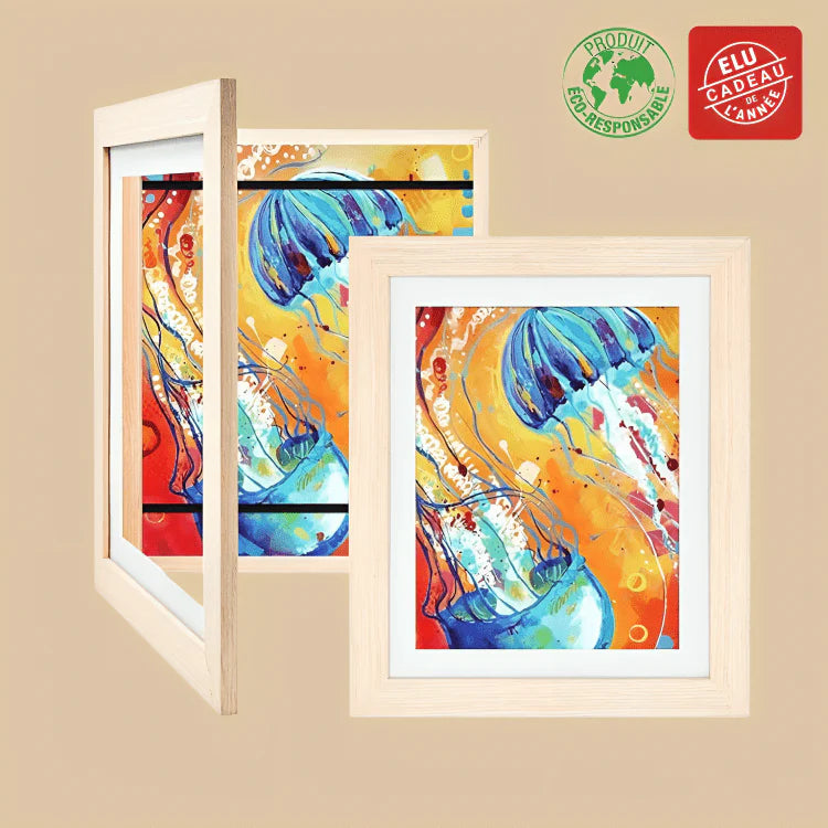 Pas besoin d’outils compliqués : fixez le cadre en quelques minutes seulement. La charnière pratique permet d’ajouter ou de remplacer les dessins sans effort.