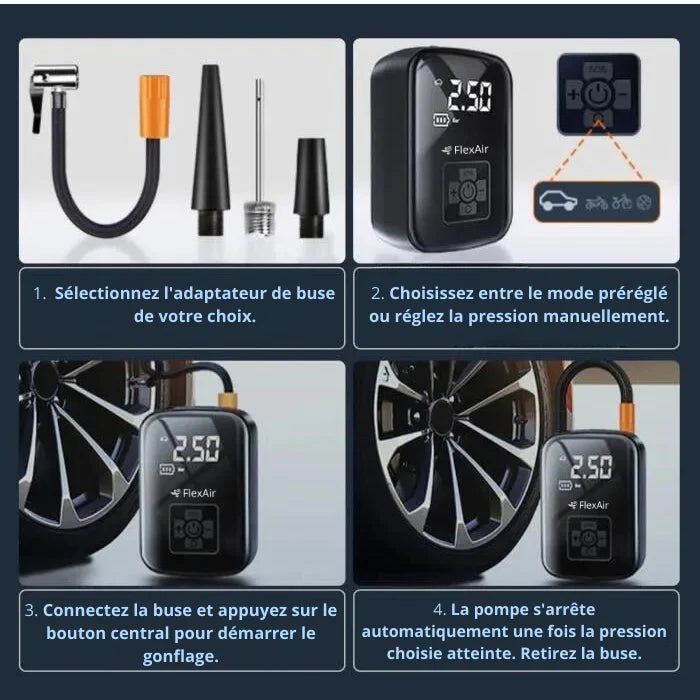 Grâce aux adaptateurs fournis, il fonctionne avec la plupart des valves : Schrader (auto, moto) et Presta (vélo). Vous trouverez également un embout pour ballons et matelas.
